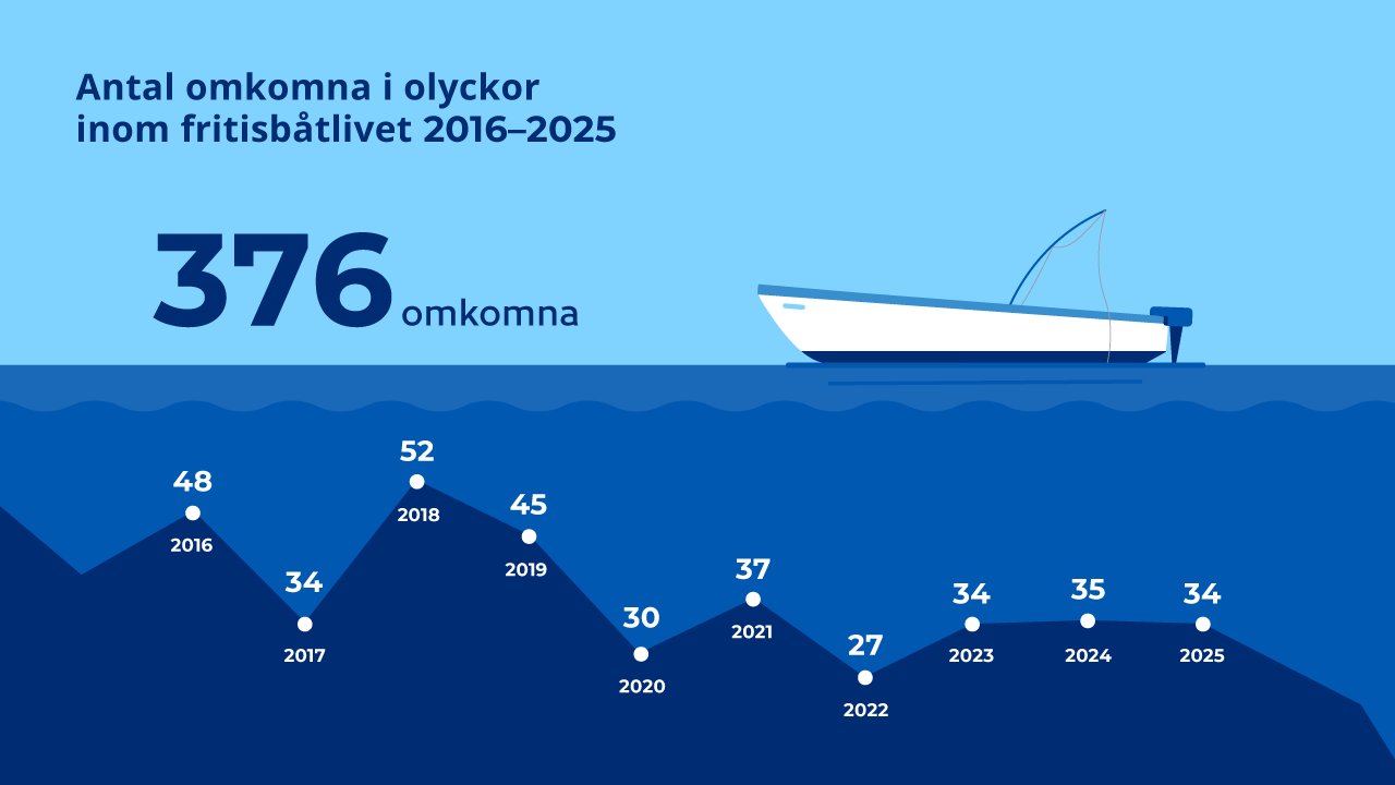 Enligt den årliga statistiken över sjöfartsolyckor inträffade 32 dödsolyckor med fritidsbåtar under 2025. I dessa olyckor omkom 34 personer, vilket var en person färre än under 2024.